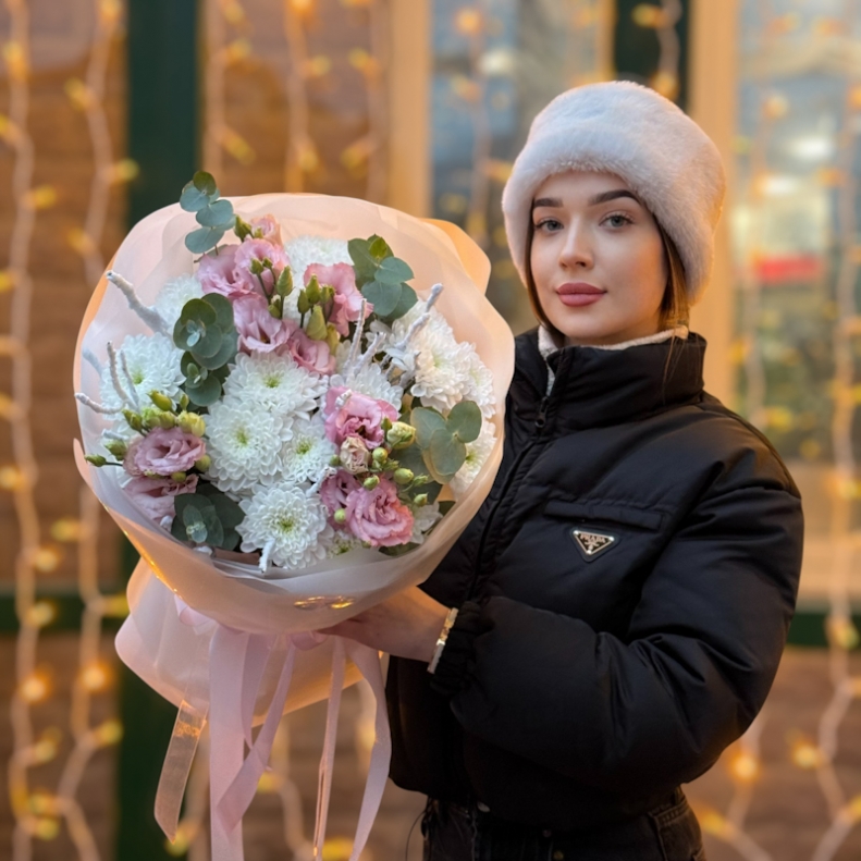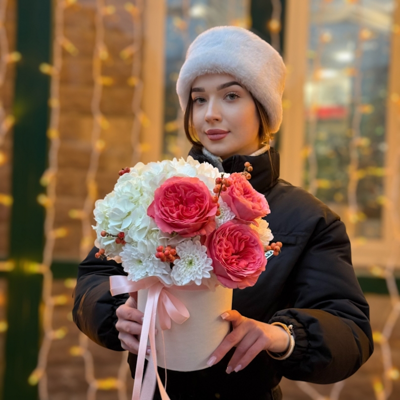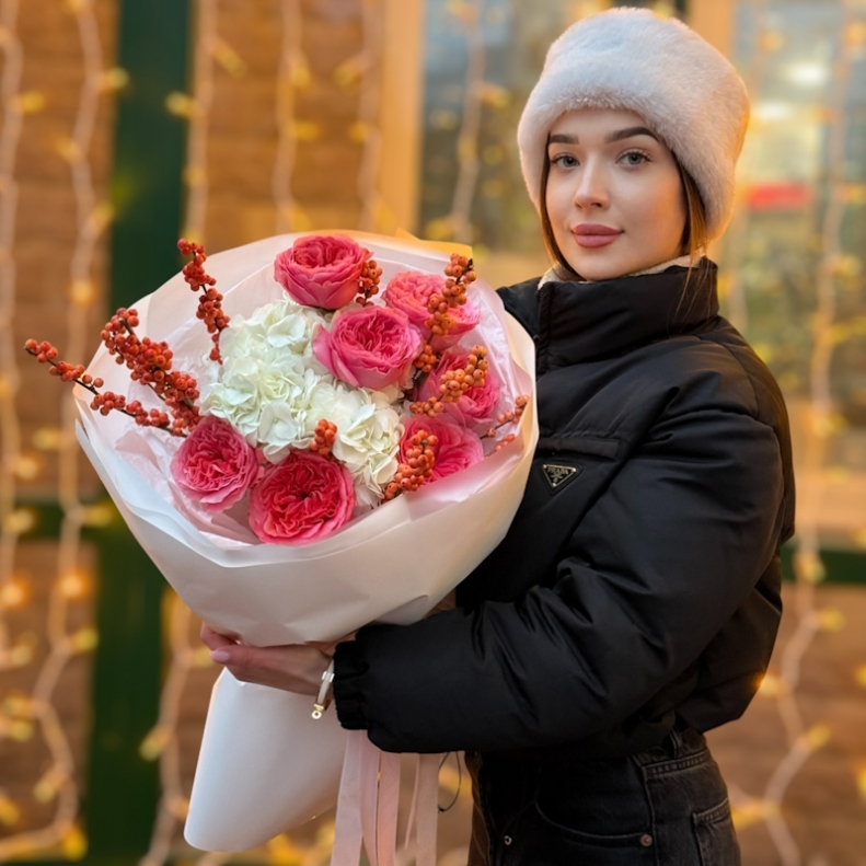 Це серія квіткових подарунків у відтінках ягід, вершків і м’якого зимового сяйва. Такі букети доречні для новорічних візитів і домашніх вечорів, коли хочеться свята без зайвого шуму.