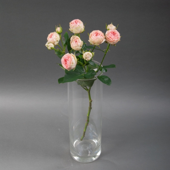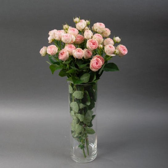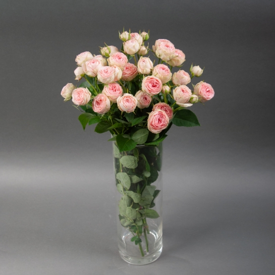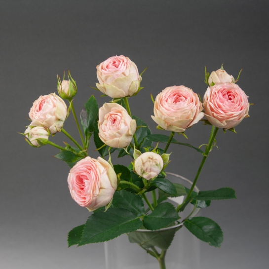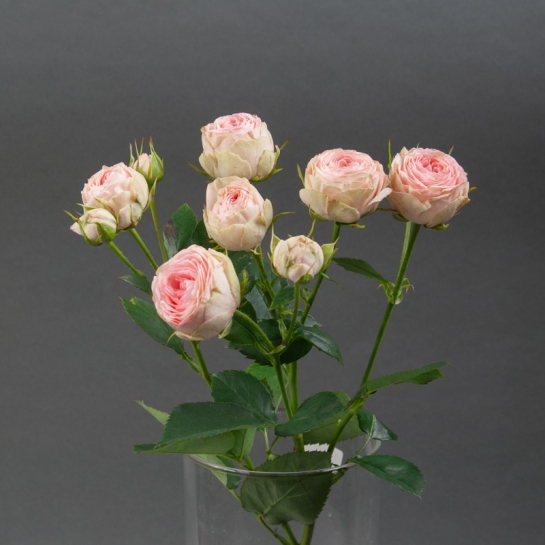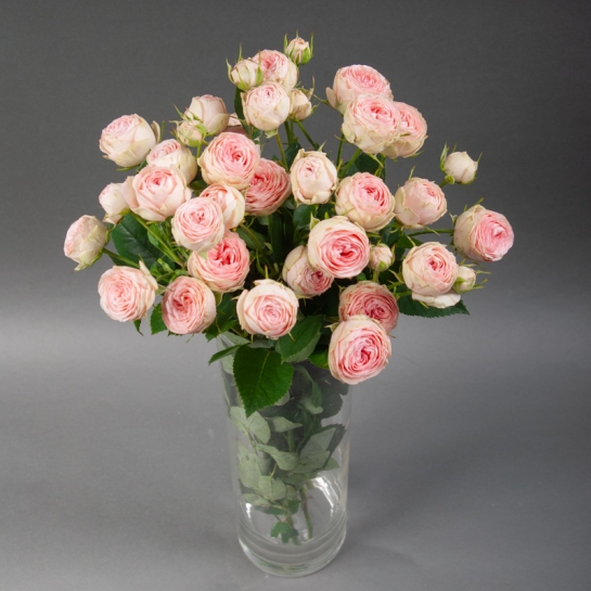 Піоноподібна троянда спрей Гранд Кай - витончений сорт, вирощений у теплицях «Камелія». Компактні густомахрові бутони ніжно-рожевого кольору з делікатною кремовою окантовкою створюють м’яку текстуру в монобукетах і додають елегантності в збірні композиції.